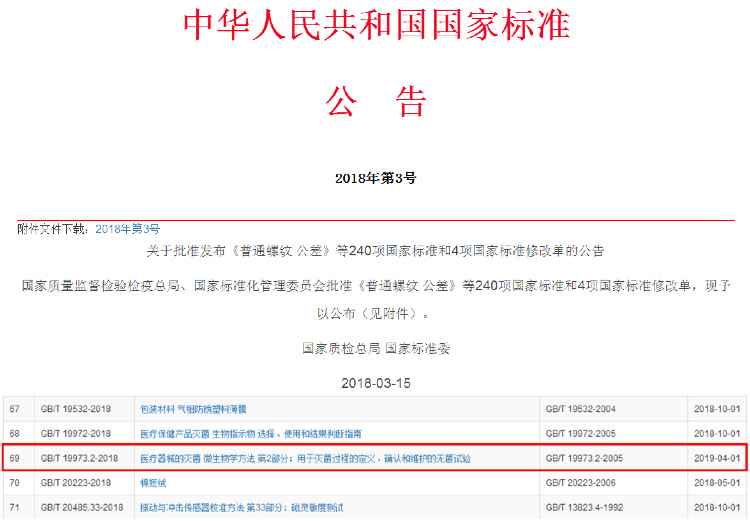 3月15日,国家质量监督检验检疫总局、国家标准化管理委员会发布2018年第3号中国国家标准公告,对新一批国家标准予以公布,其中包括了由泰林生物为第一起草单位的国家标准《医疗器械的灭菌 微生物学方法 第2部分:用于灭菌过程的定义、确认和维护的无菌试验》。