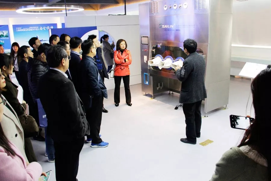 来访领导专家首先参观了泰林生物科技展厅,全面地了解了泰林生物的发展现状,医药行业领导对无菌隔离器系统、过氧化氢灭菌器、微生物检测系统及TOC分析仪等泰林核心产品产生了极大的兴趣。参观的同时也对产品的操作过程及性能特点展开了讨论,充分肯定了泰林生物的科研技术及成果。