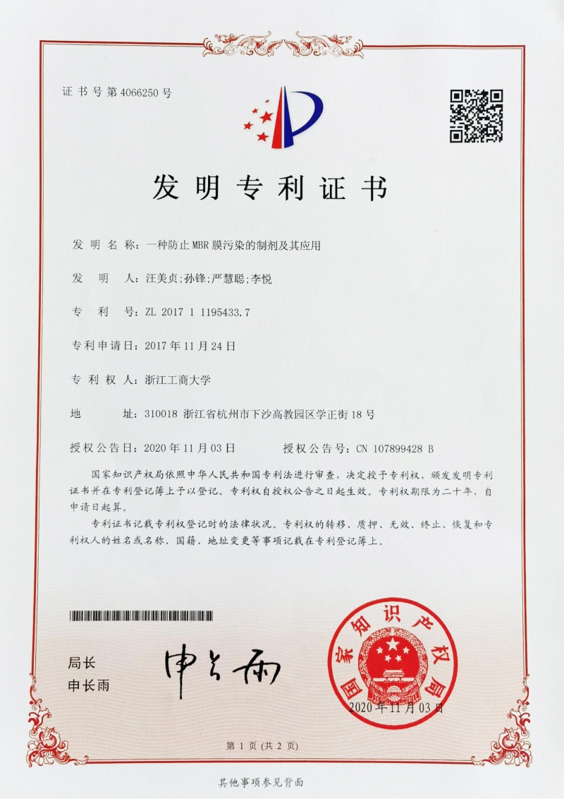 一种防止MBR膜污染的制剂及其应用ZL 2017 1 195433.7 -