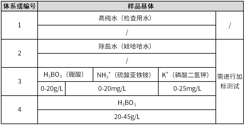 样品3(20g/L H3BO3+ 20mg/L NH3+ 25mg/L K+)混合样品为0.446mg/L,RSD1.6%;