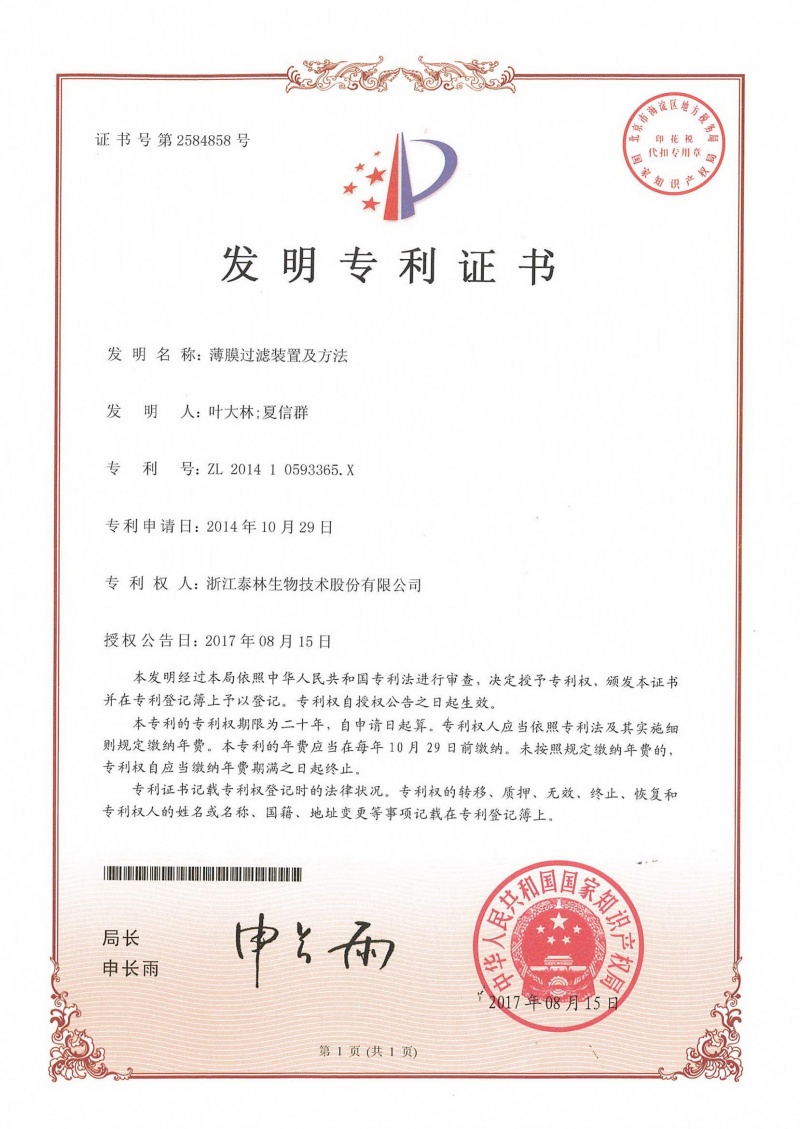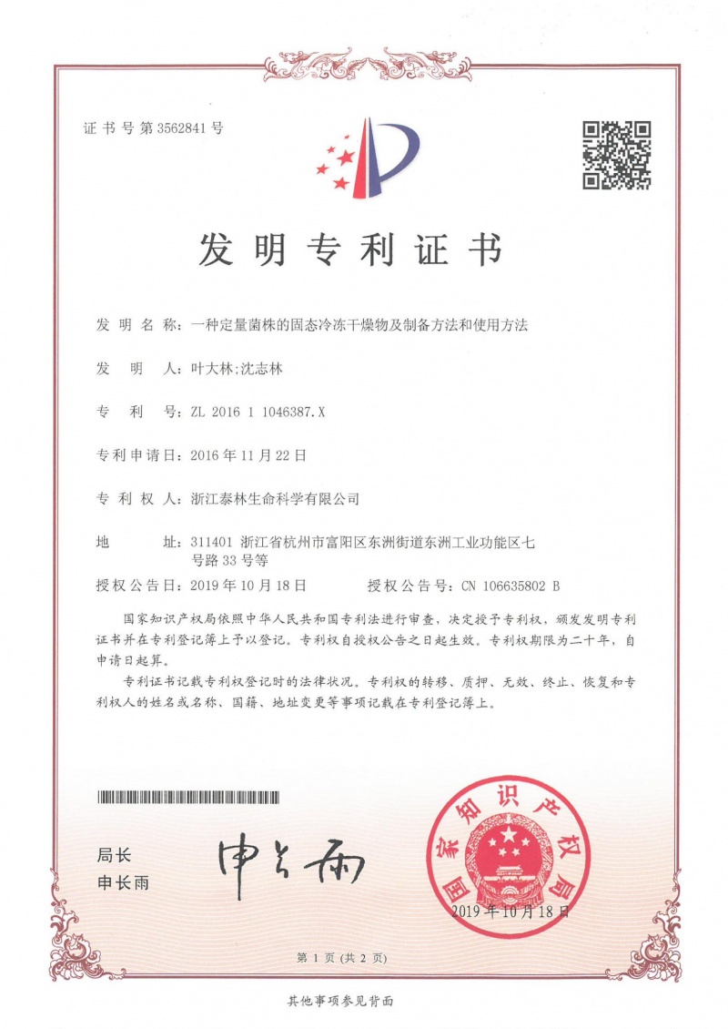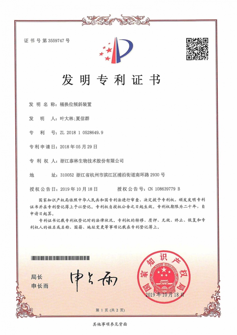 泰林生物拥有国家专利450余项,其中发明专利63项。